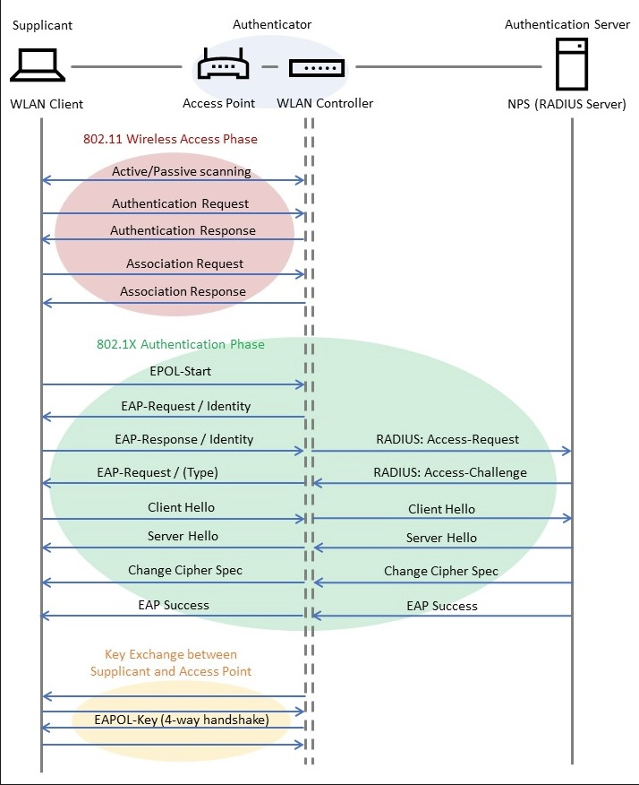 Based on the 802.1x association flow that is provided in the image above, you will need to check two logs on the windows event viewer in case of a client side issue.
